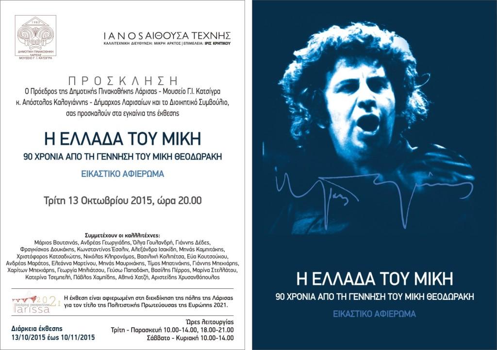 Γιορτάζοντας τα 90 χρόνια από την γέννηση του Μίκη Θεοδωράκη, η Δημοτική Πινακοθήκη Λάρισας – Μουσείο Γ. Ι. Κατσίγρα φιλοξενεί την έκθεση “Η Ελλάδα του Μίκη”, η οποία παρουσιάστηκε για πρώτη φορά με πολλή μεγάλη επιτυχία στην ΙANOS Αίθουσα Τέχνης το καλοκαίρι του 2015. Η έκθεση εγκαινιάζεται την Τρίτη 13 Οκτωβρίου στις 20:00 και πραγματοποιείται στο πλαίσιο των ιδιαίτερων δεσμών της πόλης με τον κορυφαίο Έλληνα μουσικοσυνθέτη, ο οποίος από το 1983 έχει ανακηρυχθεί επίτιμος δημότης Λάρισας.