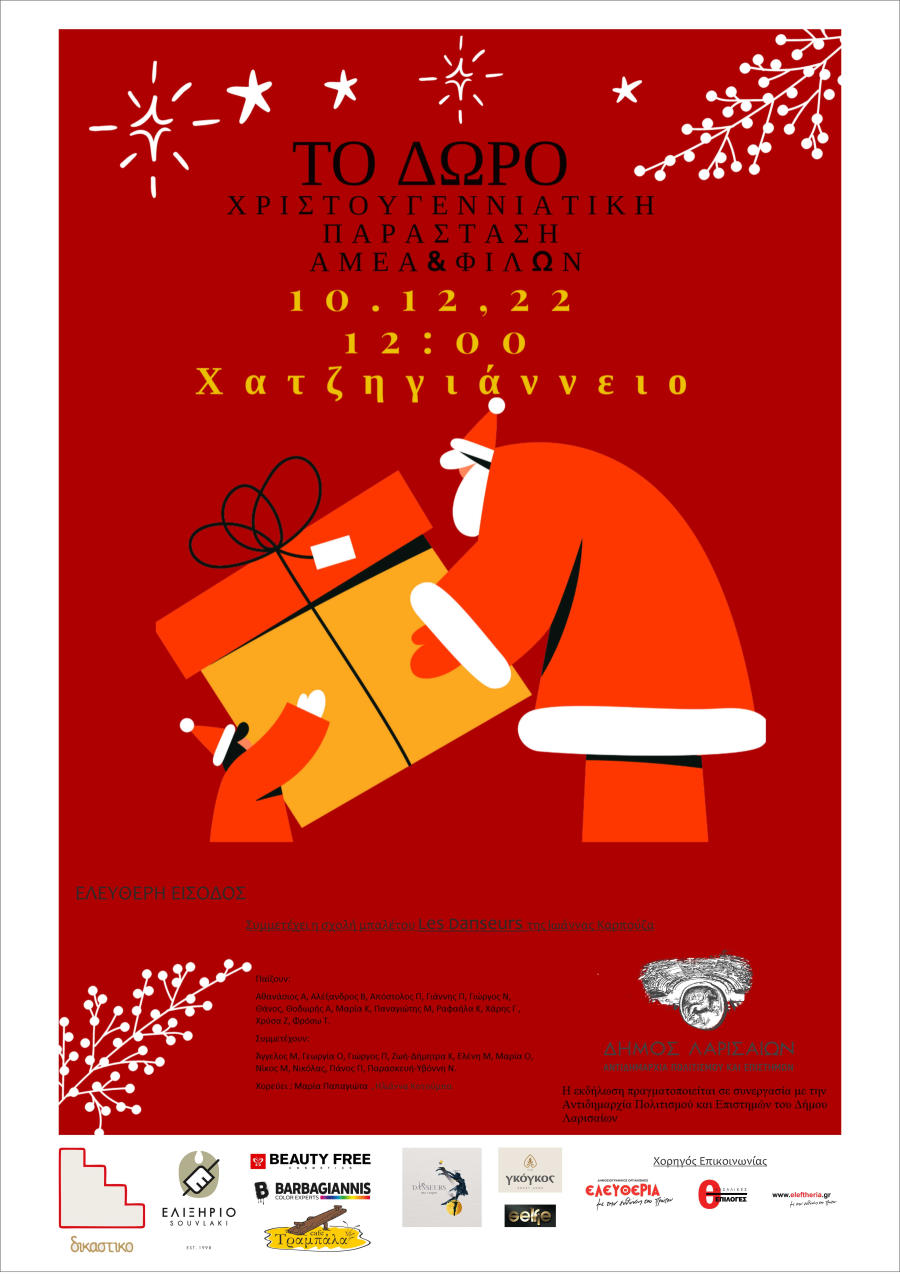 Μετά την επιτυχία των πρώτων παραστάσεών μας, η πρώτη με τίτλο “Πόση Αγάπη” στο Θεσσαλικό Θέατρο 2021 και η δεύτερη “Απόδραση αλά ελληνικά” στο Σινέ Μύλος το καλοκαίρι του 2022, ετοιμάσαμε μια νέα παράσταση “Το Δώρο”, που πραγματοποιείται σε συνεργασία με την Αντιδημαρχία Πολιτισμού και Επιστημών του Δήμου Λαρισαίων.