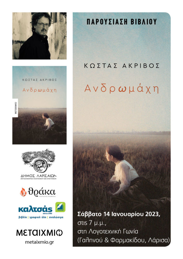 Η Αντιδημαρχία Πολιτισμού & Επιστημών του Δήμου Λαρισαίων, το περιοδικό Θράκα, το βιβλιοπωλείο Καλτσάς και οι εκδόσεις Μεταίχμιο, παρουσιάζουν το νέο μυθιστόρημα του Κώστα Ακρίβου “Ανδρωμάχη”, το Σάββατο 14 Ιανουαρίου στις 19:00, στη Λογοτεχνική Γωνία (Γαληνού & Φαρμακίδου).