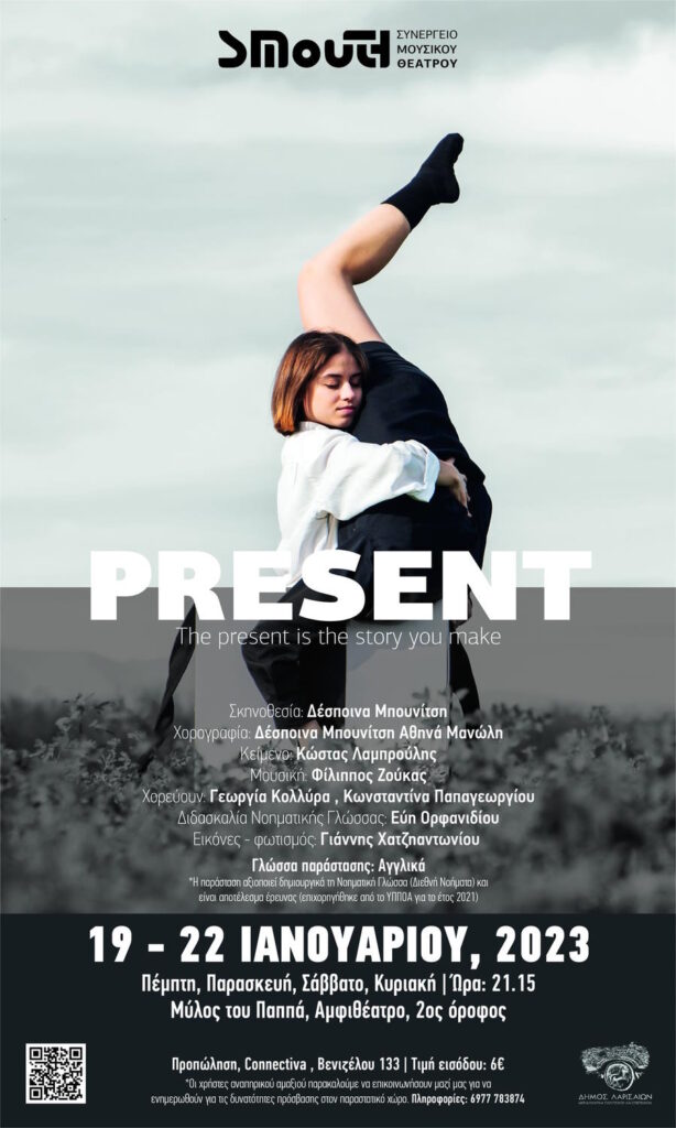Το ΣΜΟΥΘ σε συνεργασία με την Αντιδημαρχία Πολιτισμού και Επιστημών του Δήμου Λαρισαίων, παρουσιάζουν την παράσταση χοροθεάτρου Present από τις 19-22 Ιανουαρίου 2023 στις 21:15, στον Μύλο του Παππά (κεντρικό κτήριο, αμφιθέατρο, 2ος όροφος).