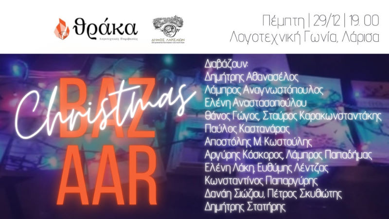 Για τις γιορτές, συγγραφείς των εκδόσεων Θράκα και φίλες/οι ποιήτριες/ές της Λάρισας θα διαβάσουν κείμενά τους στο Christmas Bazaar Βιβλίων