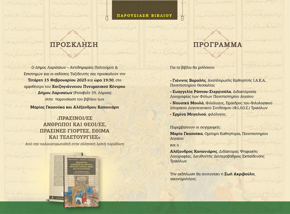 Ο Δήμος Λαρισαίων – Αντιδημαρχία Πολιτισμού & Επιστημών και οι εκδόσεις Ταξιδευτής σας προσκαλούν την Τετάρτη 15 Φεβρουαρίου 2023 και
