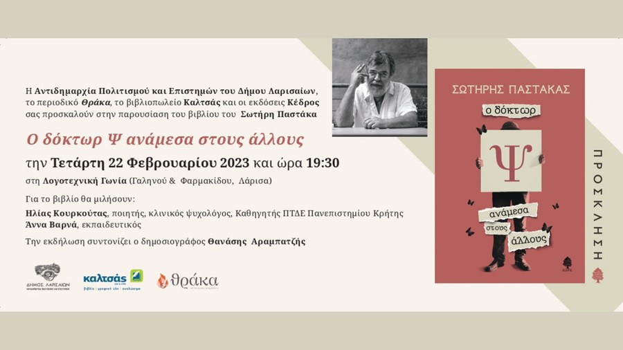 Η Αντιδημαρχία Πολιτισμού και Επιστημών του Δήμου Λαρισαίων, το περιοδικό Θράκα, το βιβλιοπωλείο Καλτσάς και οι εκδόσεις Κέδρος, διοργανώνουν την