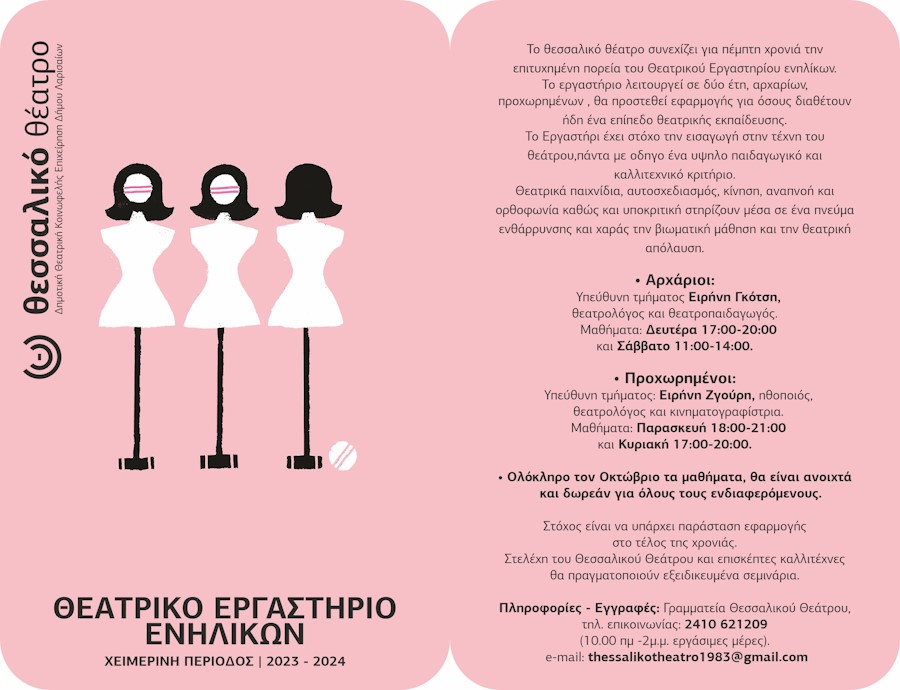 Θεατρικό Εργαστήρι Ενηλίκων του Θεσσαλικού Θεάτρου Ξεκίνησαν οι εγγραφές στο Θεατρικό Εργαστήρι Ενηλίκων του Θ.Θ. 2023 – 2024 Το Θεσσαλικό